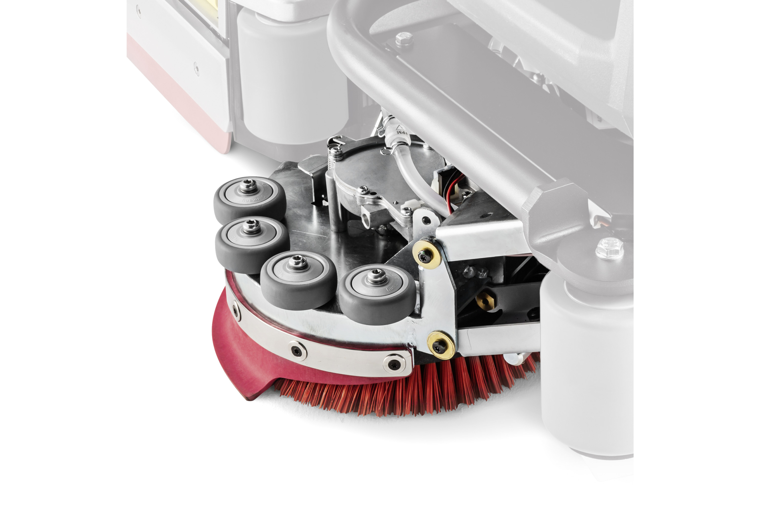 Zur randnahen Nassreinigung auf der rechten Seite: Seitenschrubbdeck mit Hebearm. Vergrößert die Arbeitsbreite um 10 cm.