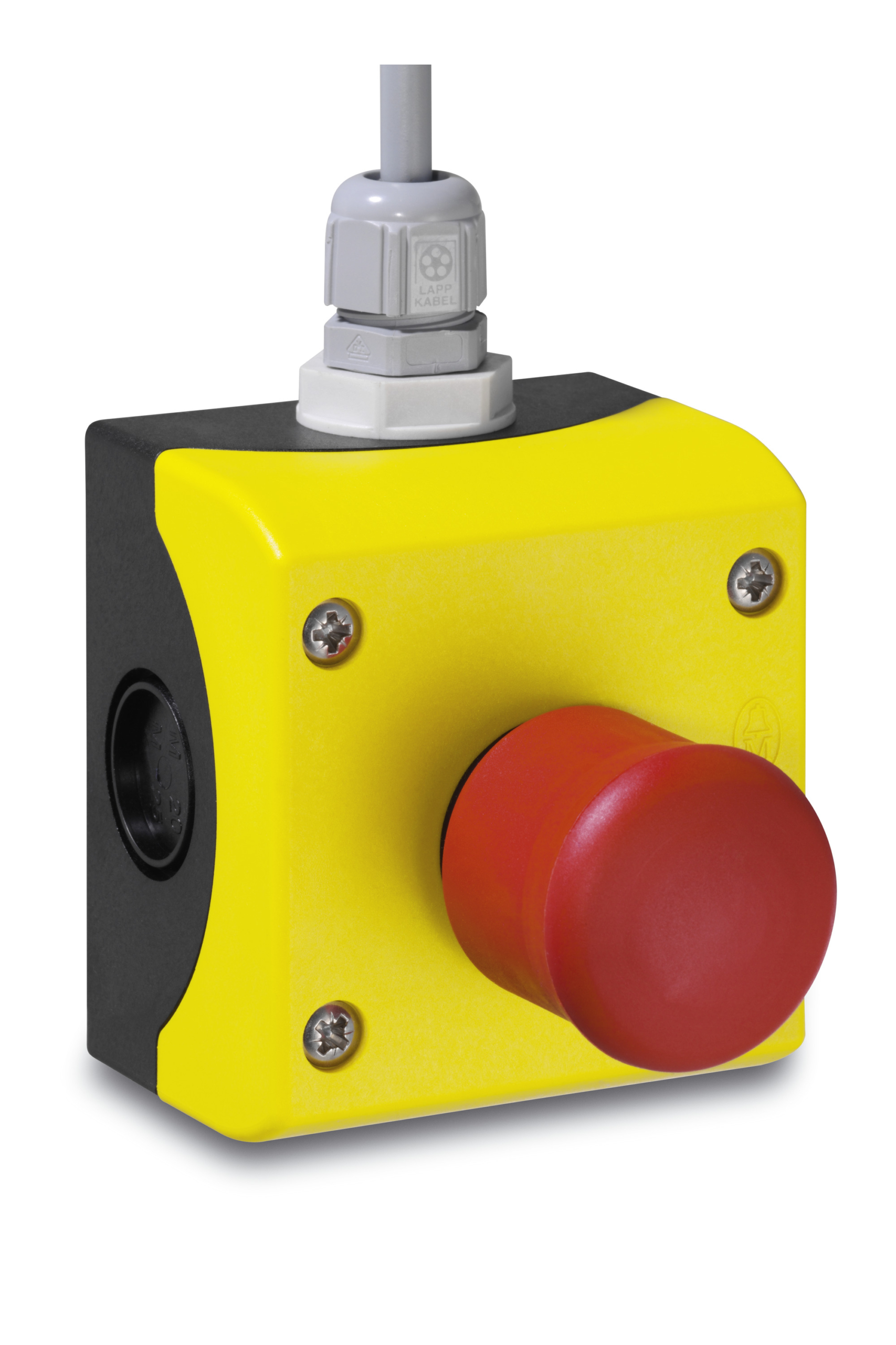 Not-Aus-Schalter mit ISO-Gehäuse zur Wandmontage. Mit 0,4 m Anschlusskabel und Befestigungsmaterial.